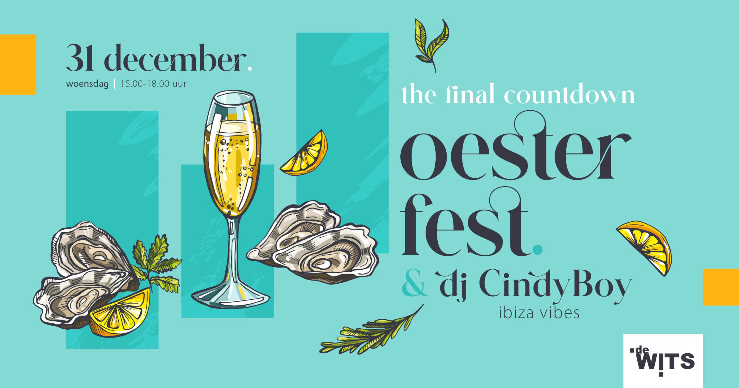 Oesterfest#thefinalcountdown Oesters € 2 p.s. naturel maak je oester blij met een topping € 1 keuze uit: Gin tonic granite / spicy mango / appel komkommer erbij  Cava glas/fles € 5 / 30 vanaf 16 jaar dj CindyBoy ibiza vibes woensdag 31 december 15.00 - 18.30 uur reserveren: 070 399 64 04, reserveren@dewits.nl